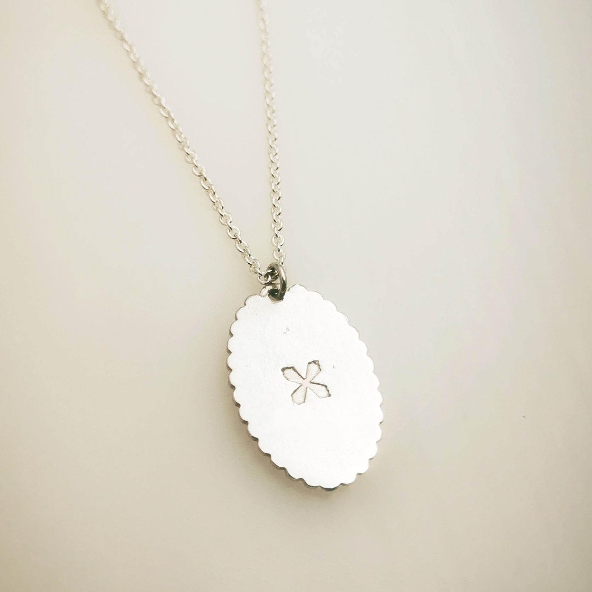 The pendant measures 18 x 28 mm and hangs from a 50 cm sterling silver chain. Other chain lengths are available upon request.