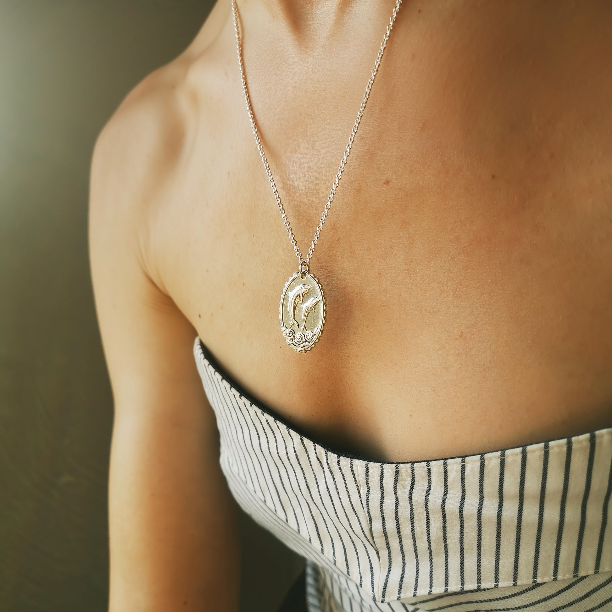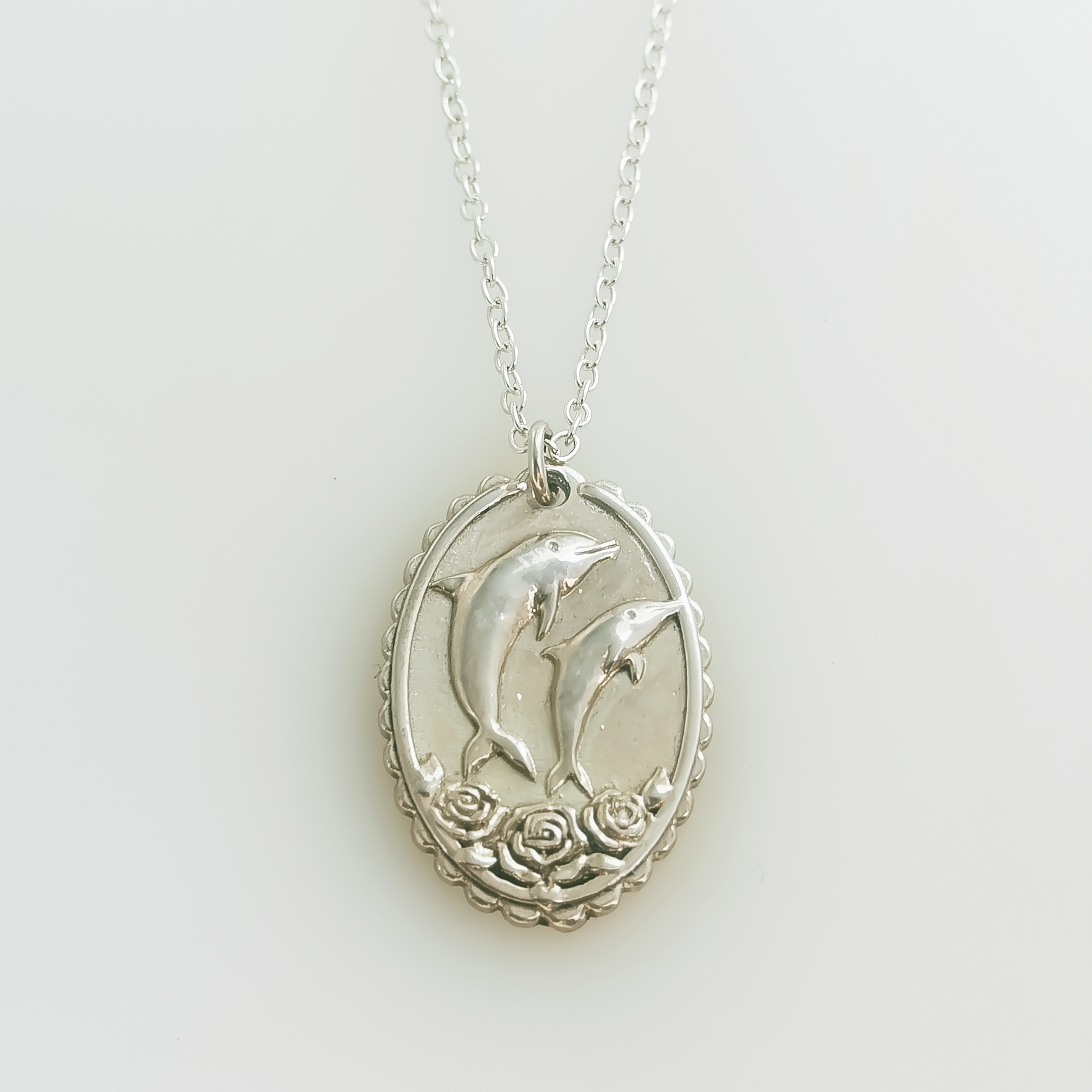 Sterling silver charm necklace featuring an oval pendant with two dolphins leaping over a bed of roses. A design that began as a kitschy experiment, now turned quietly iconic with time.