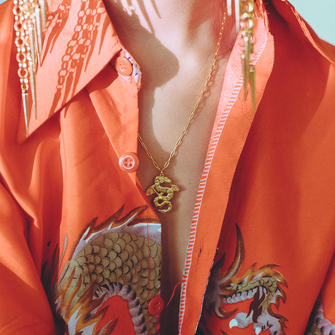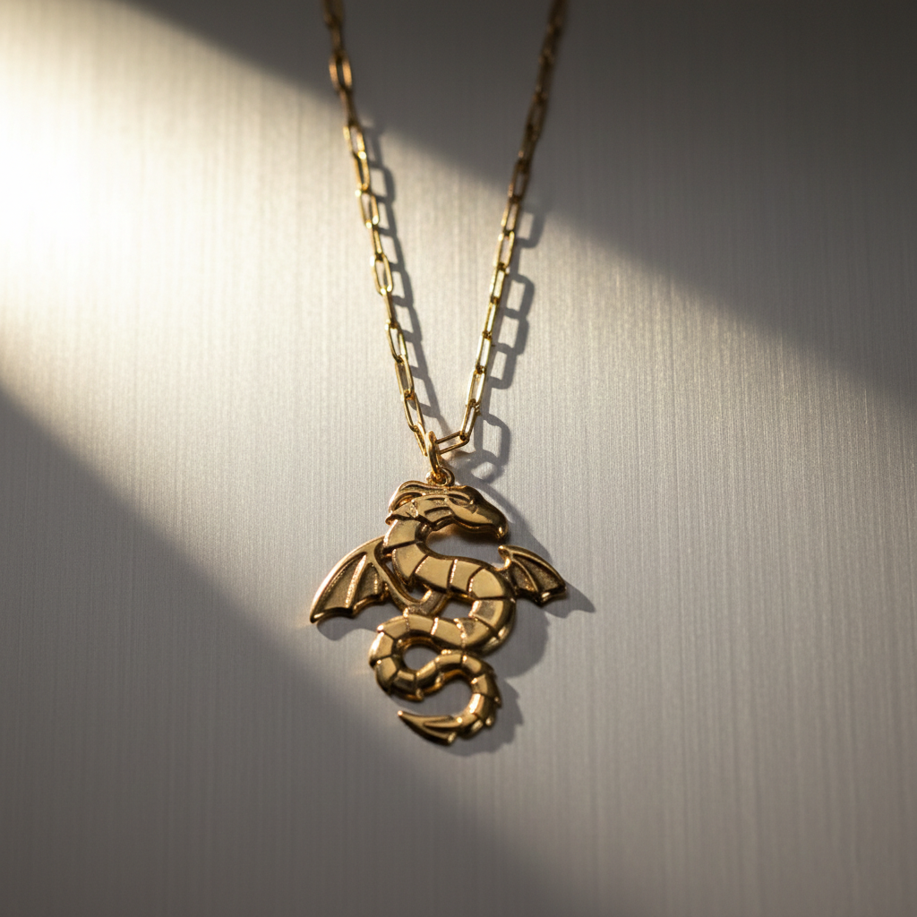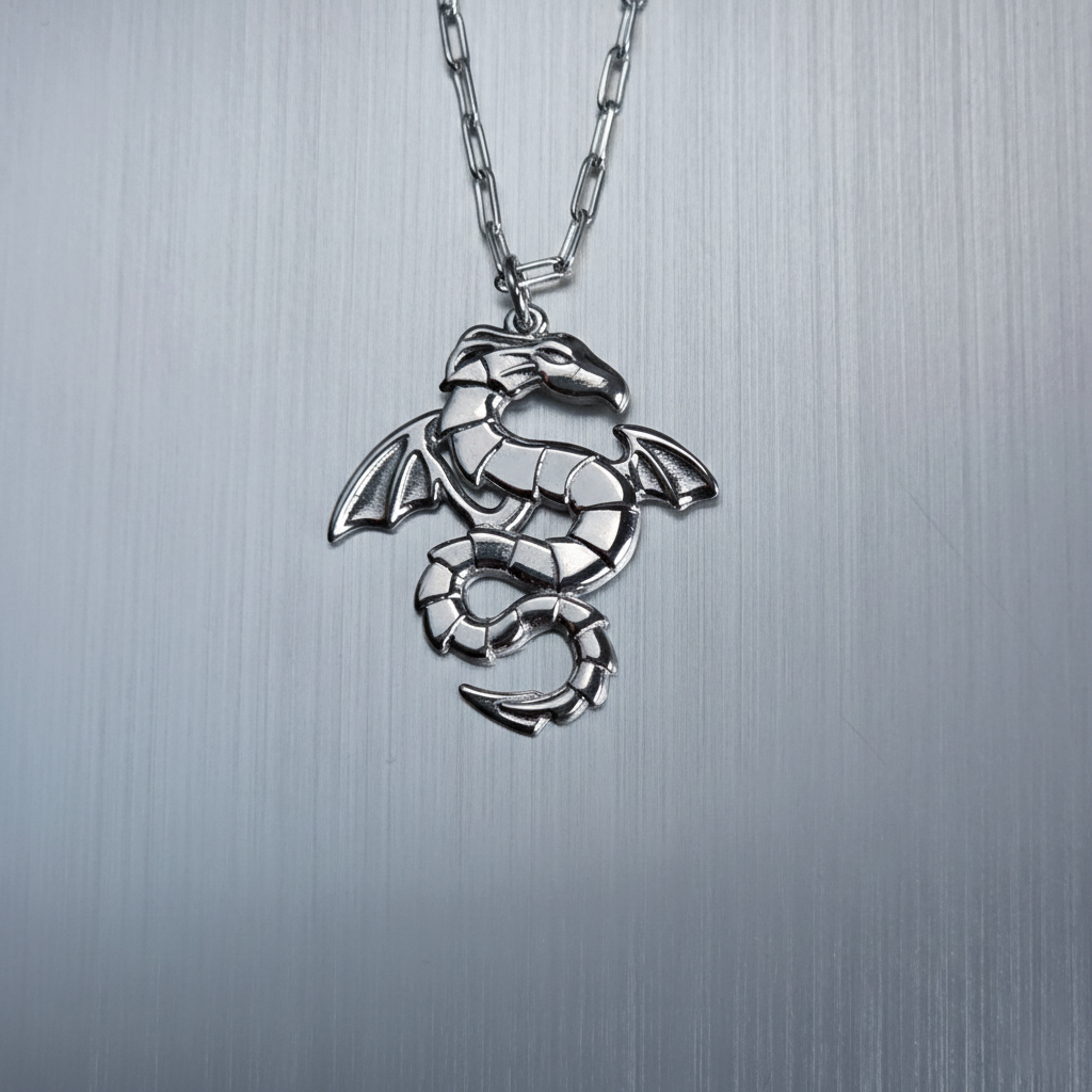 Dragon necklace crafted in sterling silver, also available in sterling silver plated with a 3-micron layer of gold. The pendant features a stylized dragon reduced to essential forms, with a compact silhouette and defined segments that give the piece structure and visual strength without unnecessary ornament.