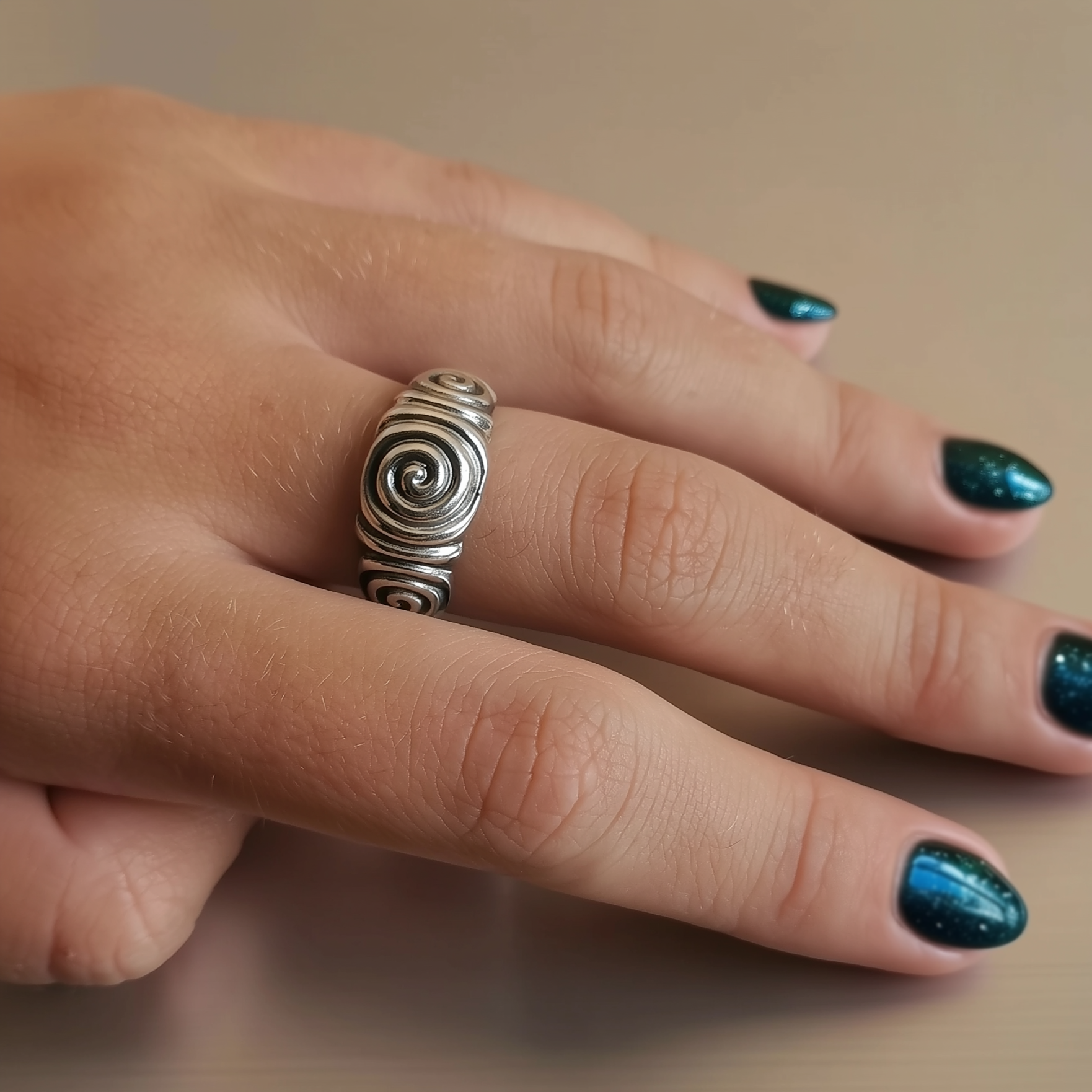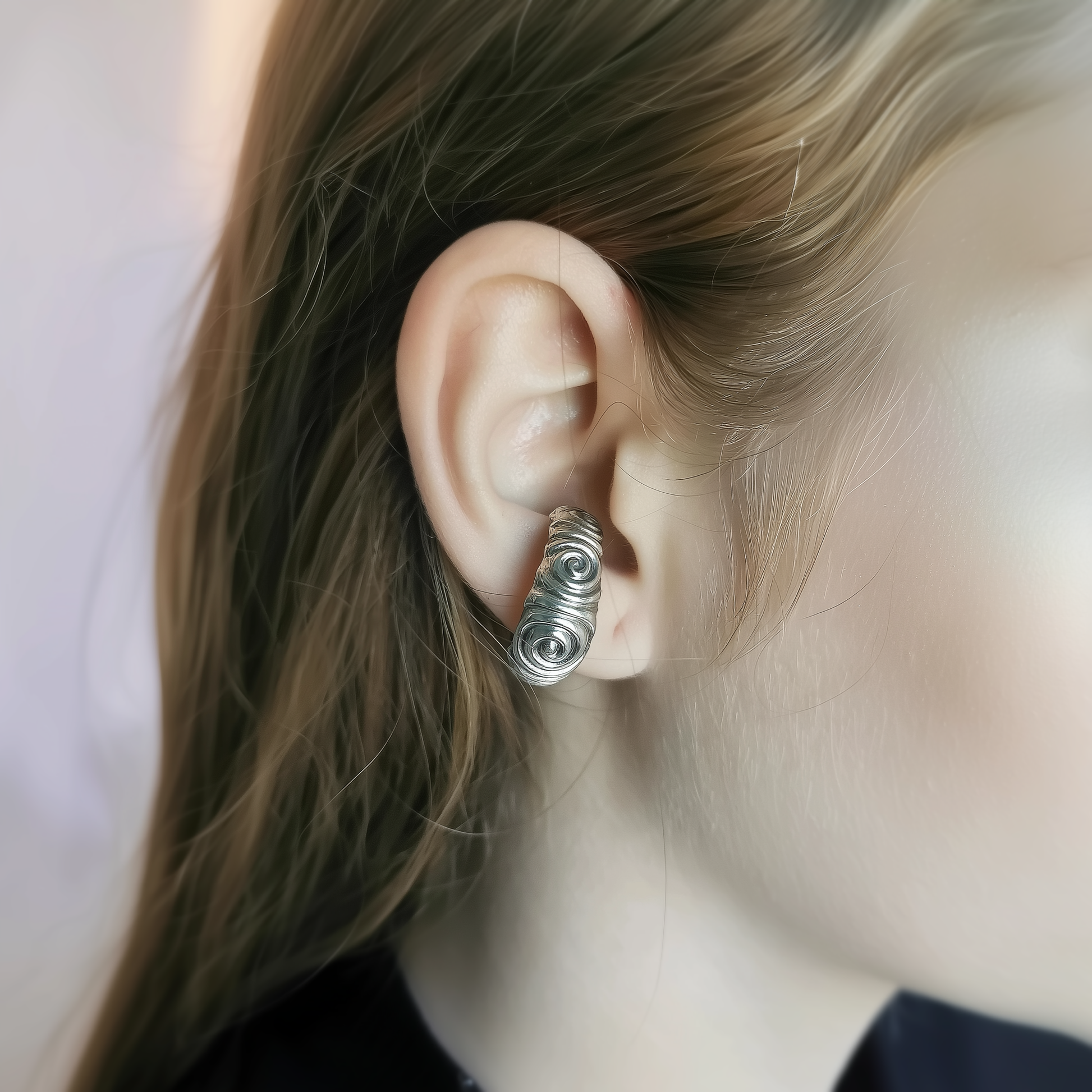The Dual Spiral is a jewelry piece in sterling silver 925, designed to be worn as a ring or an ear cuff (ear clip). Its adaptable structure and embossed spiral design evoke a connection between nature and technology, as part of a contemporary ritual to inhabit the modern world.