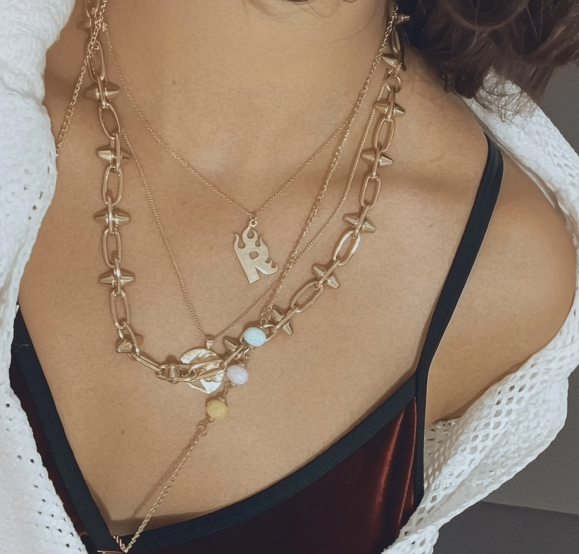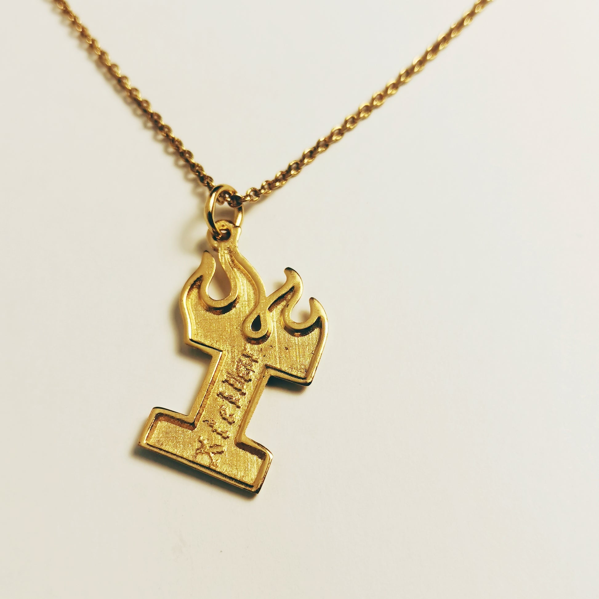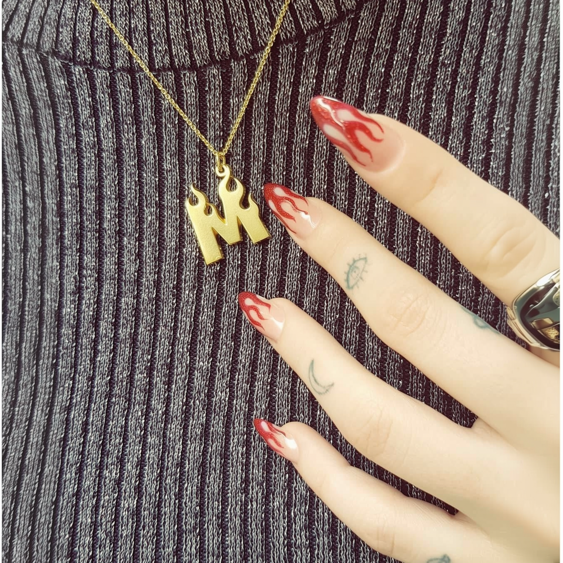 Initial necklace crafted in 925 sterling silver,plated with 2 microns of gold, featuring a letter surrounded by flames — a symbol of energy, creativity, and passion.