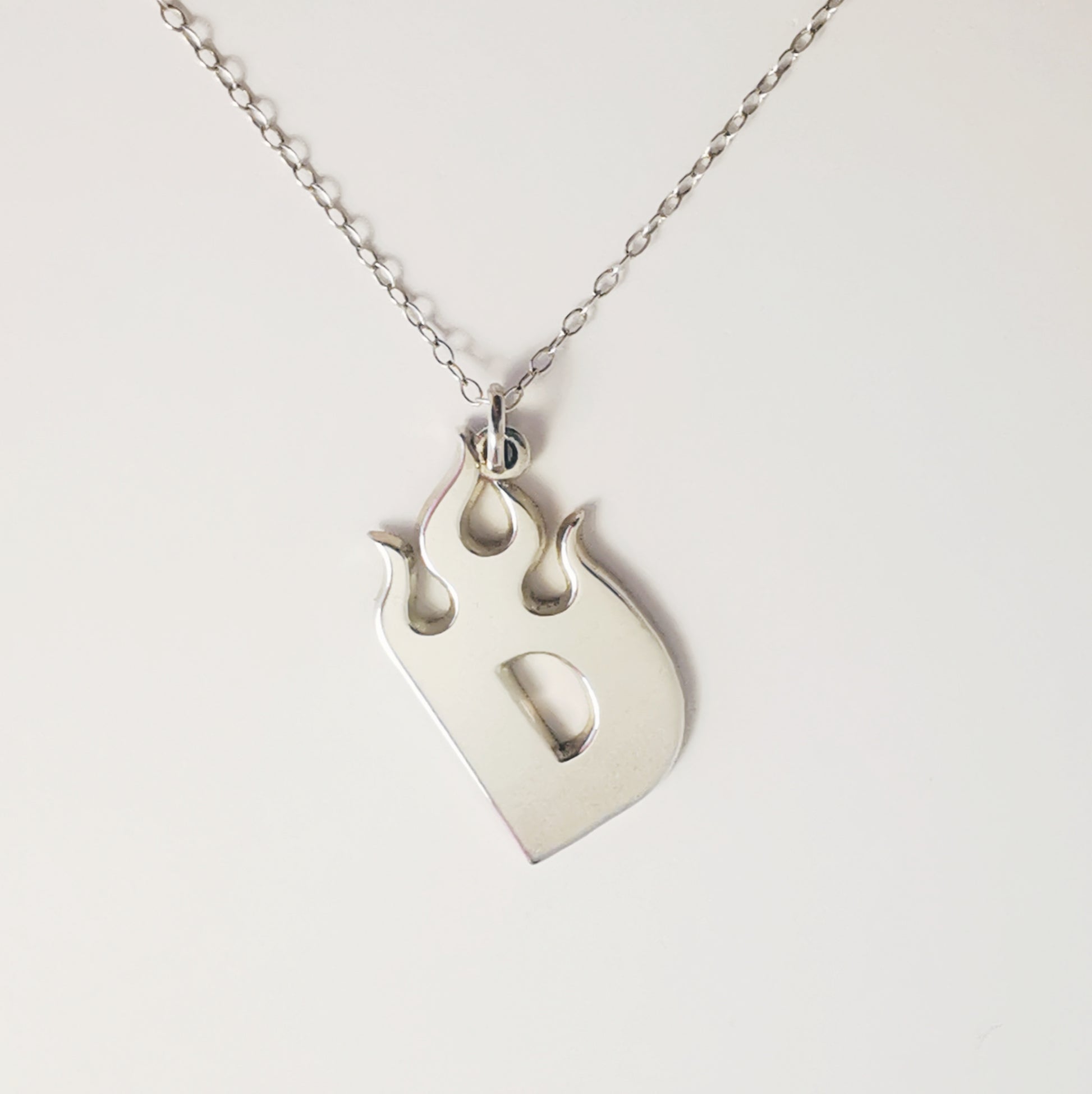 Initial necklace crafted in 925 sterling silver, featuring a letter surrounded by flames — a symbol of energy, creativity, and passion.