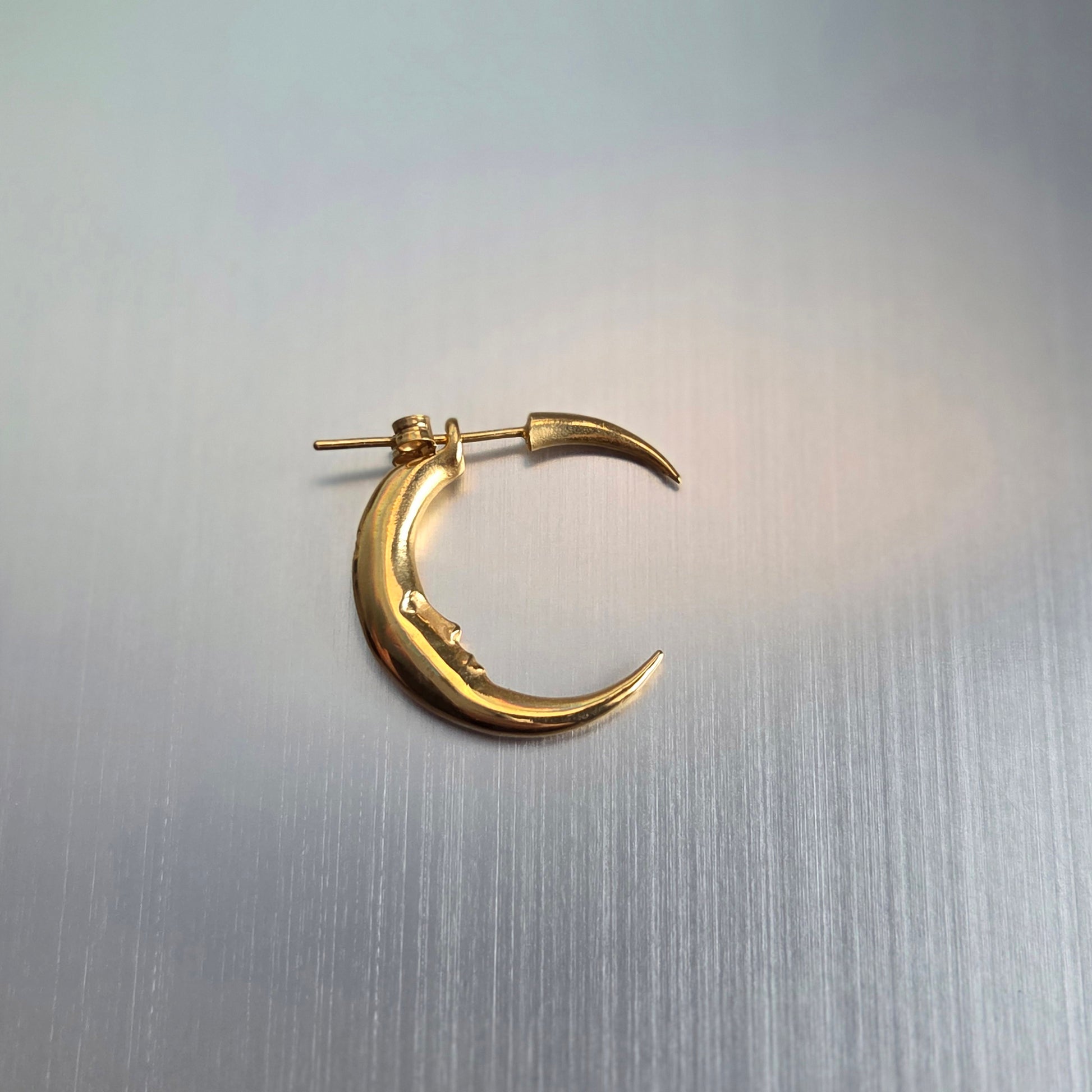 Crescent moon earring with an embossed face. A compact, solid piece designed to be comfortable and easy to wear on a daily basis. The push-back closure provides a secure and reliable fit.
