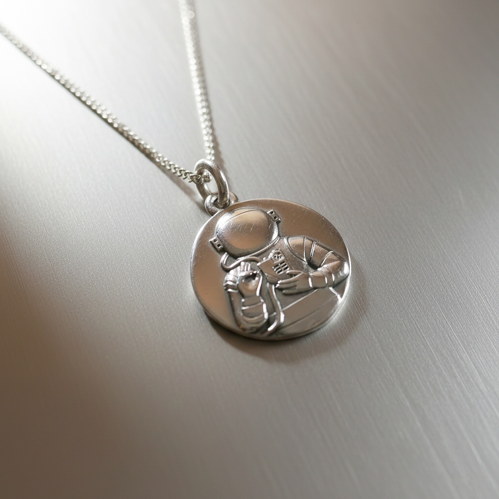 A devotional pendant… but in an astronaut suit. A nod to devotion from a different perspective.